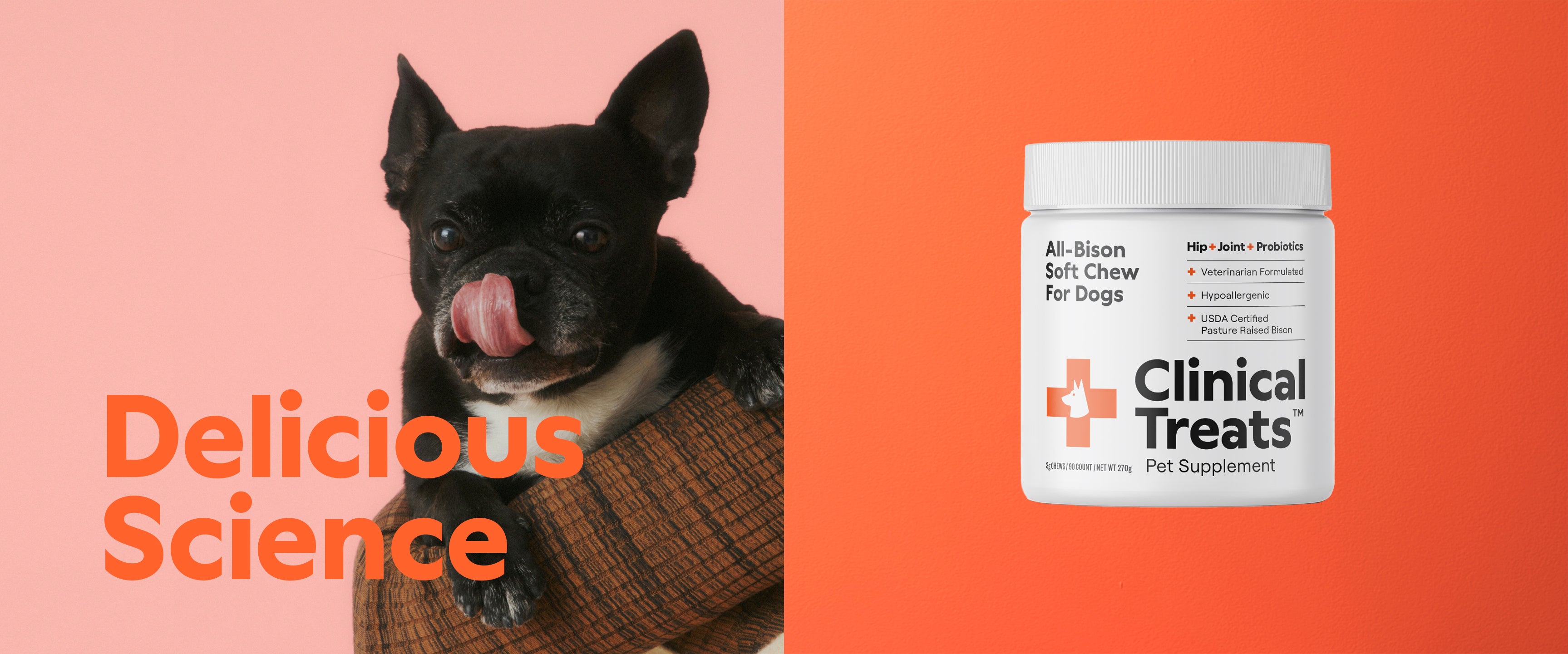 Clinical Treats is the world’s first all-bison treat infused with clinically-proven active ingredients. No fillers, no cost-saving additives, and no artificial preservatives or flavors. Wheat and grain-free, with no antibiotics or preservatives, our treat is the highest quality pet supplement on the market.